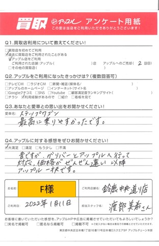 お車のご相談・ 査定だけでもOK! カンタン 入力 30秒 アップルがブランド買取始めました! お電話でも受付中! 受付時間 10:00 ~ 18:30 0120-866-446 お車のご相談・ 査定だけでもOK! カンタン 入力 30秒 アップルがブランド買取始めました! お電話でも受付中! 受付時間 10:00 ~ 18:30 0120-866-446 アップルがブランド買取始めました! お電話でも受付中! 受付時間 10:00 ~ 18:30 0120-866-446 店舗情報 在庫車 スタッフ紹介 ブログ お客様の声 キャンペーン お得 無料査定 click お客様の声 ご記入日: 2022/01/11 F様 車名:ホンダ ステップワゴン Q:あなたと愛車との思い出をお聞かせください!愛車名:ステップワゴン最高に乗りやすかったです。Q:アップルに対する感想をぜひお聞かせください!評価:大満足昔ですが他社とアップルへ行って、対応・価格がぜんぜん違い、以降アップル一択です。 前へ 次へ お客様の声一覧を見る