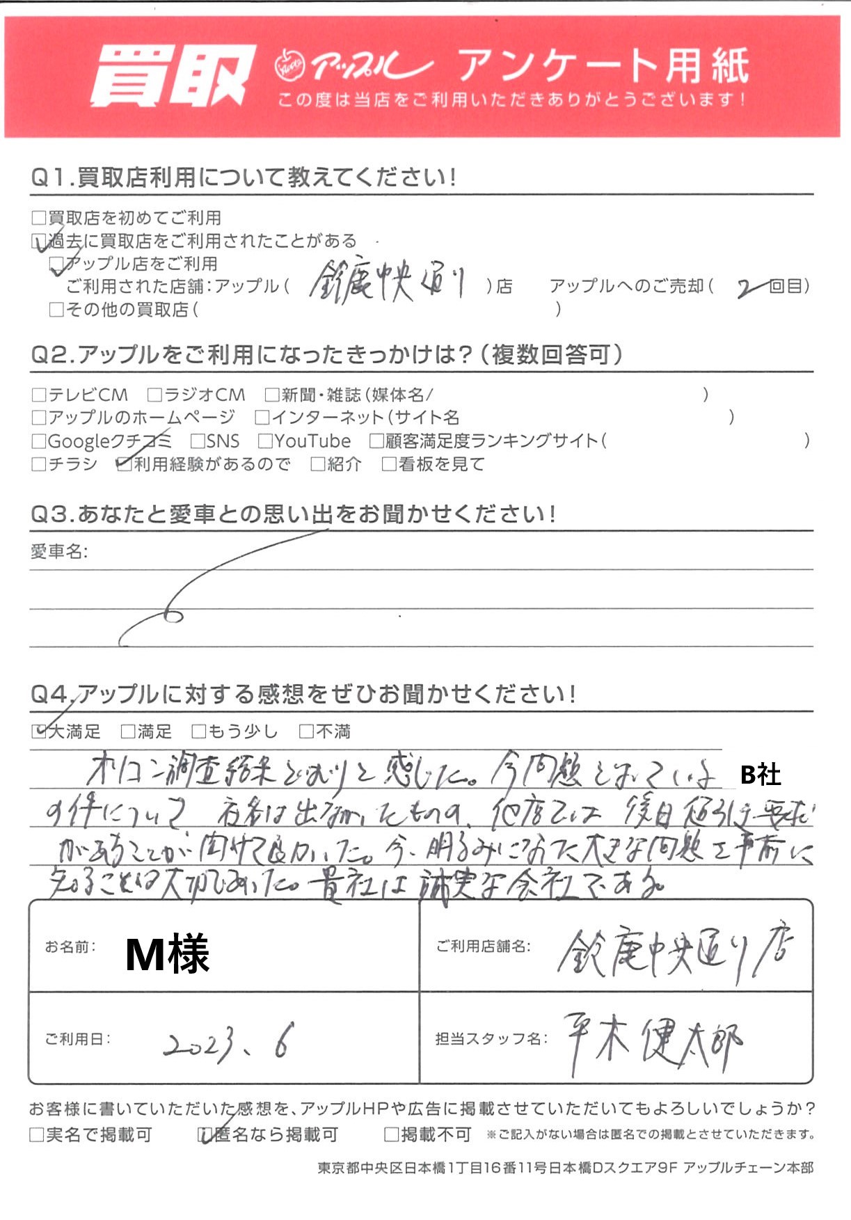 お車のご相談・ 査定だけでもOK! カンタン 入力 30秒 アップルがブランド買取始めました! お電話でも受付中! 受付時間 10:00 ~ 18:30 0120-866-446 お車のご相談・ 査定だけでもOK! カンタン 入力 30秒 アップルがブランド買取始めました! お電話でも受付中! 受付時間 10:00 ~ 18:30 0120-866-446 アップルがブランド買取始めました! お電話でも受付中! 受付時間 10:00 ~ 18:30 0120-866-446 店舗情報 在庫車 スタッフ紹介 ブログ お客様の声 キャンペーン お得 無料査定 click お客様の声 ご記入日: 2023/06/06 M様 ◎アップルに対する感想をぜひお聞かせください! 大満足 オリコン調査結果どおりと感じた。今問題となっている問題の件について社名はでなかものの他店では後日値引き要求があることが聞けて良かった。今、明るみになった大きな問題を事前に知ることは大切であった。貴社は誠実な会社である。 前へ 次へ お客様の声一覧を見る