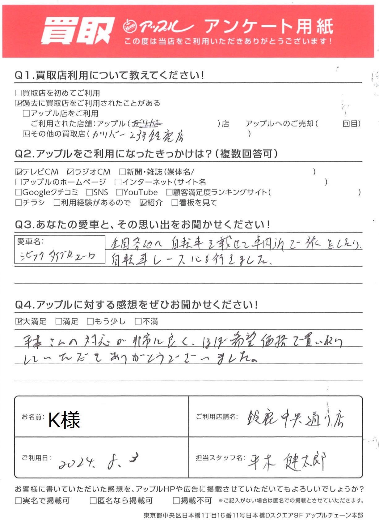 お車のご相談・ 査定だけでもOK! カンタン 入力 30秒 アップルがブランド買取始めました! お電話でも受付中! 受付時間 10:00 ~ 18:30 0120-866-446 お車のご相談・ 査定だけでもOK! カンタン 入力 30秒 アップルがブランド買取始めました! お電話でも受付中! 受付時間 10:00 ~ 18:30 0120-866-446 アップルがブランド買取始めました! お電話でも受付中! 受付時間 10:00 ~ 18:30 0120-866-446 店舗情報 在庫車 スタッフ紹介 ブログ お客様の声 キャンペーン お得 無料査定 click お客様の声 ご記入日: 2024/08/03 K様 車名:ホンダ ◎あなたの愛車と、その思い出をお聞かせください!◎愛車名:シビックタイプRユーロ 全国各地へ自転車を載せて車内泊で旅をしたり自転車レースにも行きました。◎アップルに対する感想をぜひお聞かせください!◎ 平木さんの対応が非常に良く、ほぼ希望価格で買い取りしていただきありがとうございました。 前へ 次へ お客様の声一覧を見る