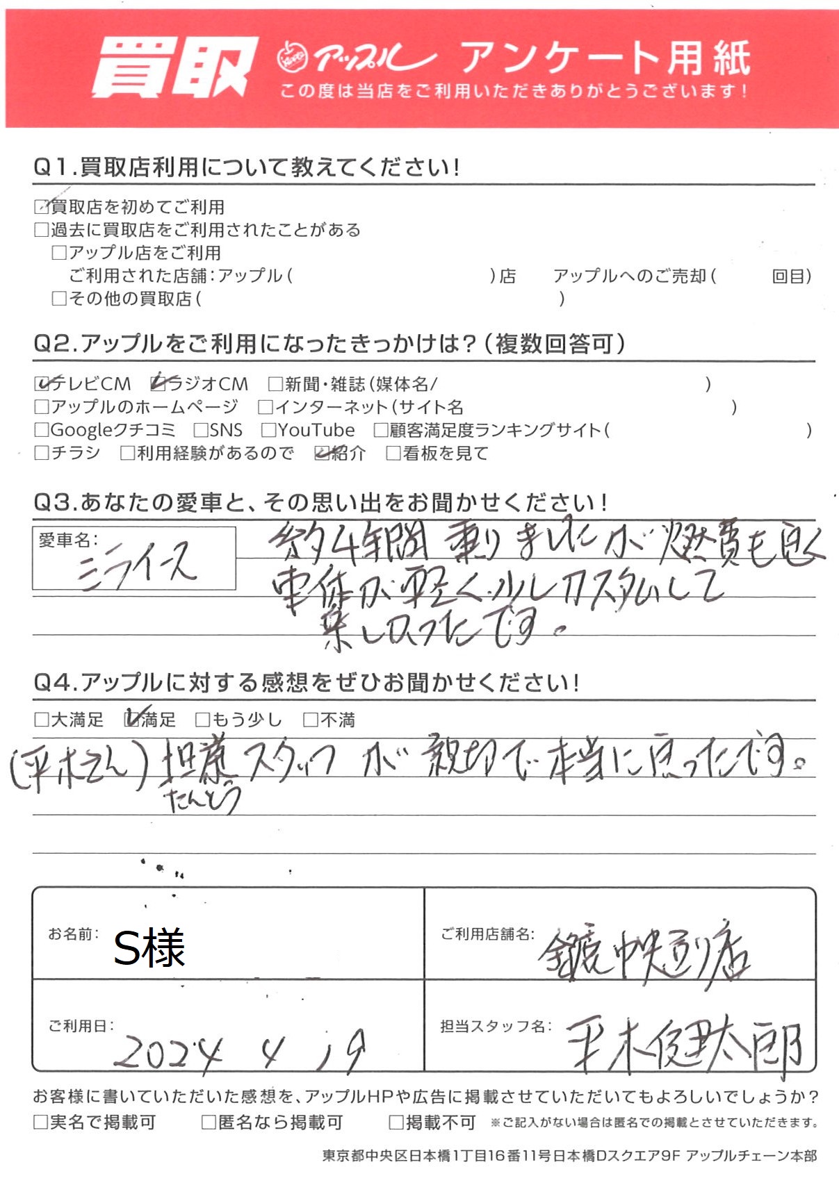 お車のご相談・ 査定だけでもOK! カンタン 入力 30秒 アップルがブランド買取始めました! お電話でも受付中! 受付時間 10:00 ~ 18:30 0120-866-446 お車のご相談・ 査定だけでもOK! カンタン 入力 30秒 アップルがブランド買取始めました! お電話でも受付中! 受付時間 10:00 ~ 18:30 0120-866-446 アップルがブランド買取始めました! お電話でも受付中! 受付時間 10:00 ~ 18:30 0120-866-446 店舗情報 在庫車 スタッフ紹介 ブログ お客様の声 キャンペーン お得 無料査定 click お客様の声 ご記入日: 2024/04/19 S様 車名:ダイハツ ミライース ◎あなたの愛車と、その思い出をお聞かせください!◎愛車名:ミライ―ス 約4年間乗りましたが燃費も良く車体が軽く、少しカスタムして楽しかったです。◎アップルに対する感想をぜひお聞かせください!◎ 満足(平木さん) 担当スタッフが親切で本当に良かったです。 前へ 次へ お客様の声一覧を見る