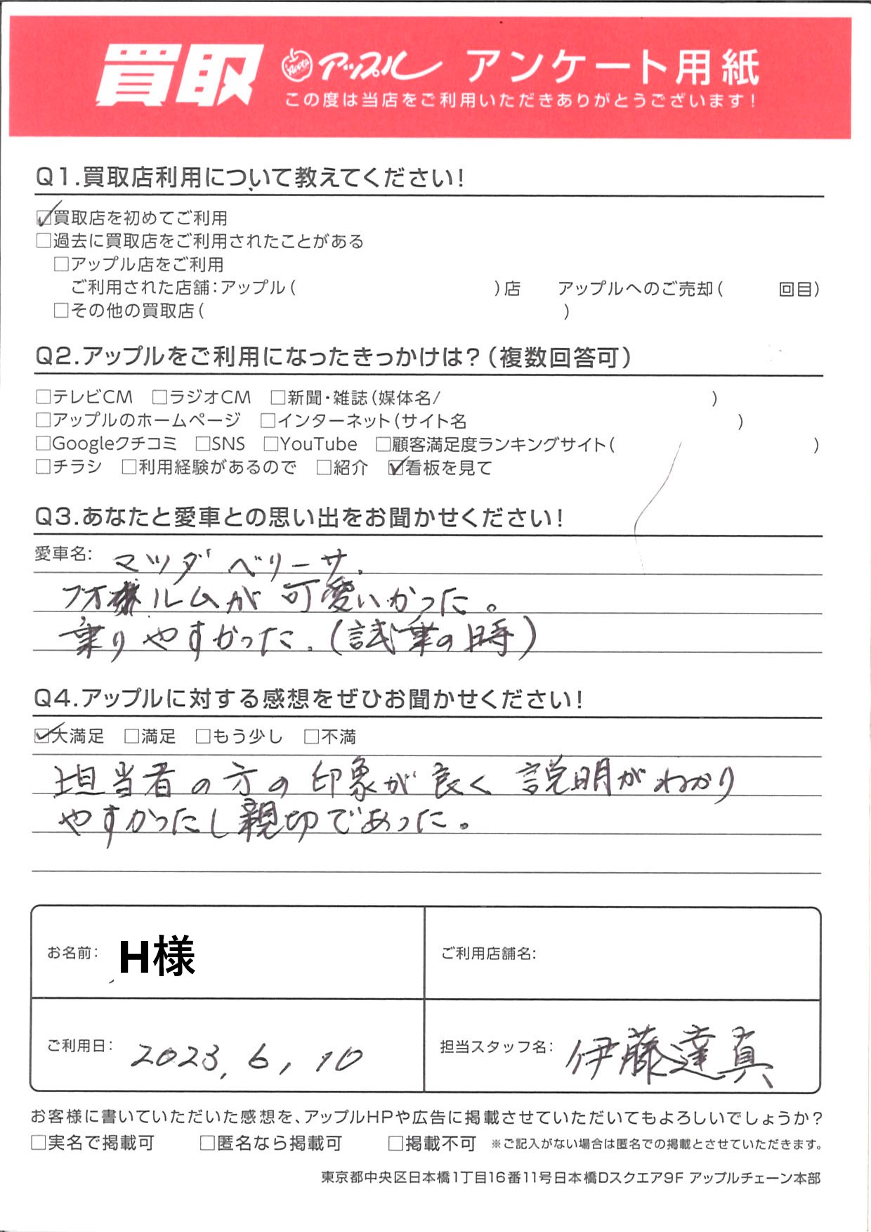 お車のご相談・ 査定だけでもOK! カンタン 入力 30秒 アップルがブランド買取始めました! お電話でも受付中! 受付時間 10:00 ~ 18:30 0120-866-446 お車のご相談・ 査定だけでもOK! カンタン 入力 30秒 アップルがブランド買取始めました! お電話でも受付中! 受付時間 10:00 ~ 18:30 0120-866-446 アップルがブランド買取始めました! お電話でも受付中! 受付時間 10:00 ~ 18:30 0120-866-446 店舗情報 在庫車 スタッフ紹介 ブログ お客様の声 キャンペーン お得 無料査定 click お客様の声 ご記入日: 2023/06/10 H様 車名:マツダ ベリーサ ◎あなたと愛車の思い出をお聞かせください!◎愛車名:マツダ ベリーサフォルムが可愛かった。乗りやすかった。(試乗の時)◎アップルに対する感想をぜひお聞かせください!◎大満足担当者の方の印象が良く説明がわかりやすかったし親切であった。 前へ 次へ お客様の声一覧を見る