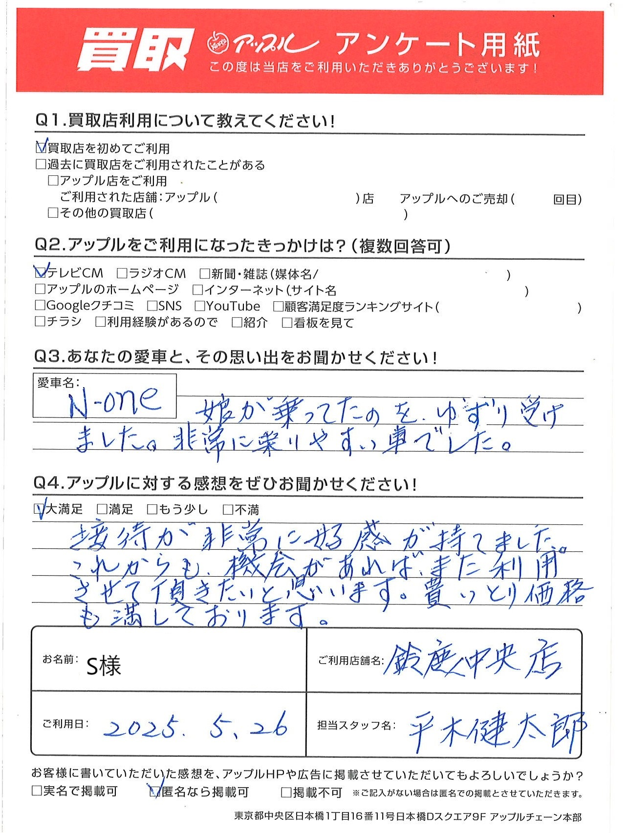 お車のご相談・ 査定だけでもOK! カンタン 入力 30秒 アップルがブランド買取始めました! お電話でも受付中! 受付時間 10:00 ~ 18:30 0120-866-446 お車のご相談・ 査定だけでもOK! カンタン 入力 30秒 アップルがブランド買取始めました! お電話でも受付中! 受付時間 10:00 ~ 18:30 0120-866-446 アップルがブランド買取始めました! お電話でも受付中! 受付時間 10:00 ~ 18:30 0120-866-446 店舗情報 在庫車 スタッフ紹介 ブログ お客様の声 キャンペーン お得 無料査定 click お客様の声 ご記入日: -/-/- S様 車名:ホンダ ◎あなたの愛車と、その思い出をお聞かせください!◎愛車名:N-ONE 娘が乗ってたのをゆずり受けました。非常に乗りやすい車でした。◎アップルに対する感想をお聞かせください!◎接待が非常に好感が持てました。これからも、機会があればまた利用させて頂きたいと思います。買いとり価格も満しております。 前へ 次へ お客様の声一覧を見る