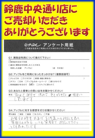 お車のご相談・ 査定だけでもOK! カンタン 入力 30秒 アップルがブランド買取始めました! お電話でも受付中! 受付時間 10:00 ~ 18:30 0120-866-446 お車のご相談・ 査定だけでもOK! カンタン 入力 30秒 アップルがブランド買取始めました! お電話でも受付中! 受付時間 10:00 ~ 18:30 0120-866-446 アップルがブランド買取始めました! お電話でも受付中! 受付時間 10:00 ~ 18:30 0120-866-446 店舗情報 在庫車 スタッフ紹介 ブログ お客様の声 キャンペーン お得 無料査定 click お客様の声 ご記入日: 2016/07/09 Y.M様 当店をご利用頂きまして、誠にありがとうございます。またのご来店をスタッフ一同、心よりお待ちしております。 前へ 次へ お客様の声一覧を見る
