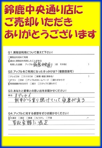 お車のご相談・ 査定だけでもOK! カンタン 入力 30秒 アップルがブランド買取始めました! お電話でも受付中! 受付時間 10:00 ~ 18:30 0120-866-446 お車のご相談・ 査定だけでもOK! カンタン 入力 30秒 アップルがブランド買取始めました! お電話でも受付中! 受付時間 10:00 ~ 18:30 0120-866-446 アップルがブランド買取始めました! お電話でも受付中! 受付時間 10:00 ~ 18:30 0120-866-446 店舗情報 在庫車 スタッフ紹介 ブログ お客様の声 キャンペーン お得 無料査定 click お客様の声 ご記入日: 2016/11/13 K.M様 当店をご利用頂きまして、誠にありがとうございます。またのご来店をスタッフ一同、心よりお待ちしております。 前へ 次へ お客様の声一覧を見る