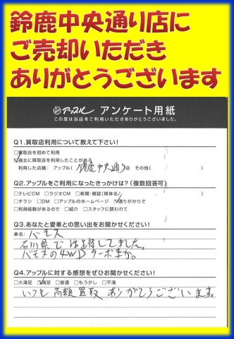 お車のご相談・ 査定だけでもOK! カンタン 入力 30秒 アップルがブランド買取始めました! お電話でも受付中! 受付時間 10:00 ~ 18:30 0120-866-446 お車のご相談・ 査定だけでもOK! カンタン 入力 30秒 アップルがブランド買取始めました! お電話でも受付中! 受付時間 10:00 ~ 18:30 0120-866-446 アップルがブランド買取始めました! お電話でも受付中! 受付時間 10:00 ~ 18:30 0120-866-446 店舗情報 在庫車 スタッフ紹介 ブログ お客様の声 キャンペーン お得 無料査定 click お客様の声 ご記入日: 2017/02/18 M.A様 当店をご利用頂きまして、誠にありがとうございます。またのご来店をスタッフ一同、心よりお待ちしております。 前へ 次へ お客様の声一覧を見る