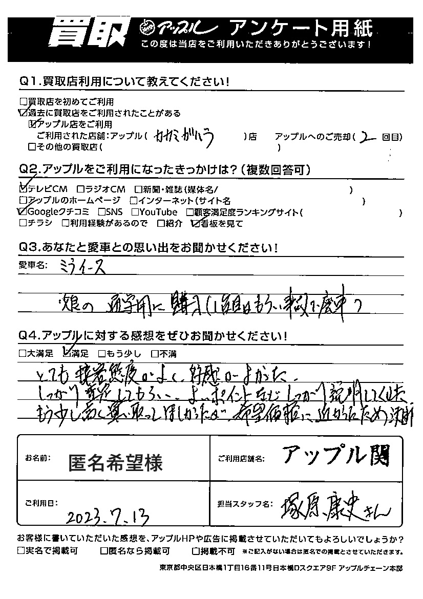 匿名希望様 車名:ダイハツ ミライース