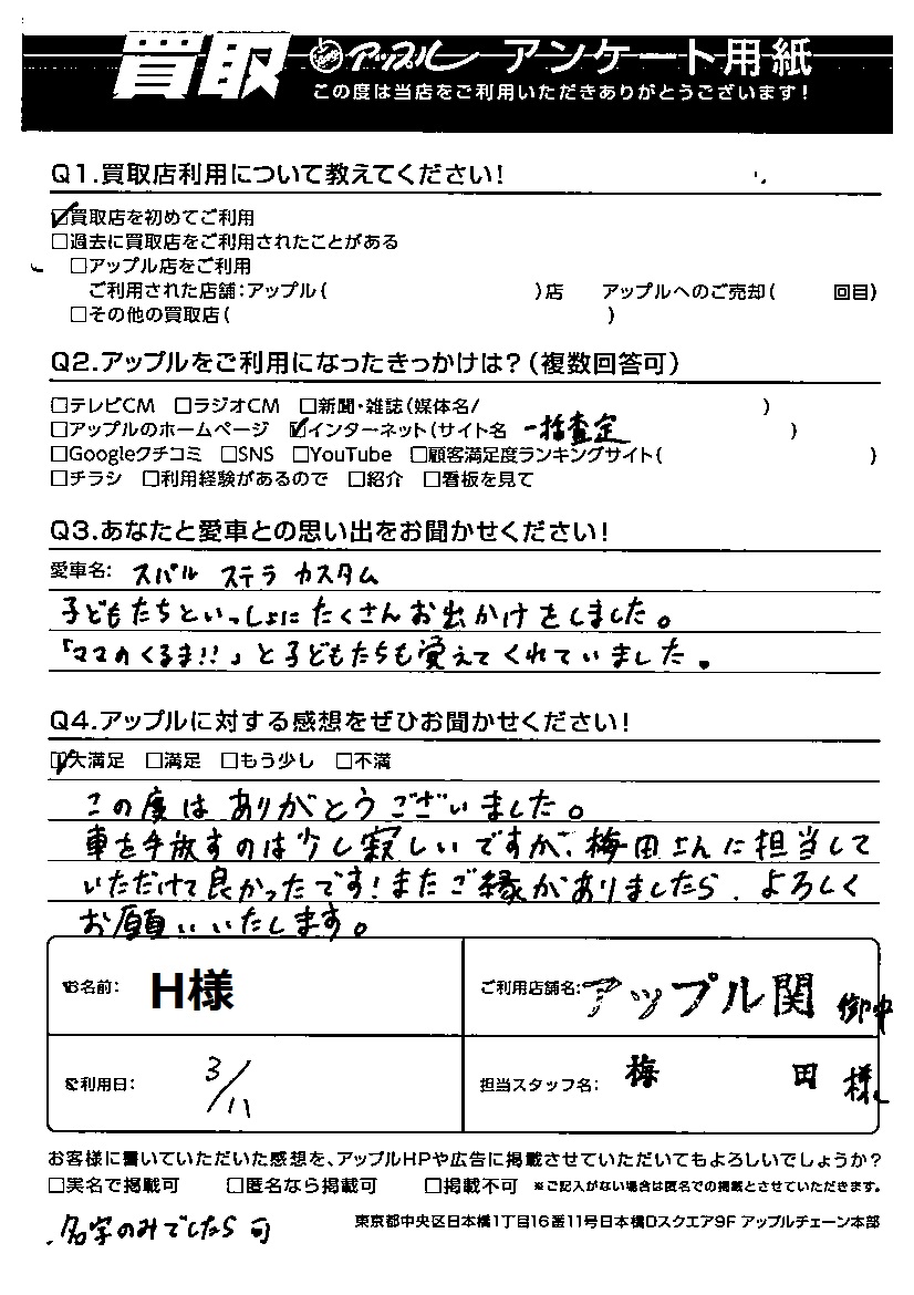 車を手放すのは少し寂しいですが、梅田さんに担当していただけて良かったです!またご縁がありましたら、よろしくお願いいたします。