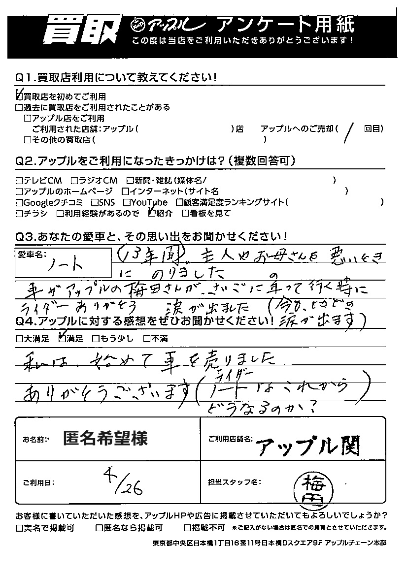 車がアップルの梅田さんが、さいごに乗って行く時に涙が出ました。(今もときどき涙が出ます)