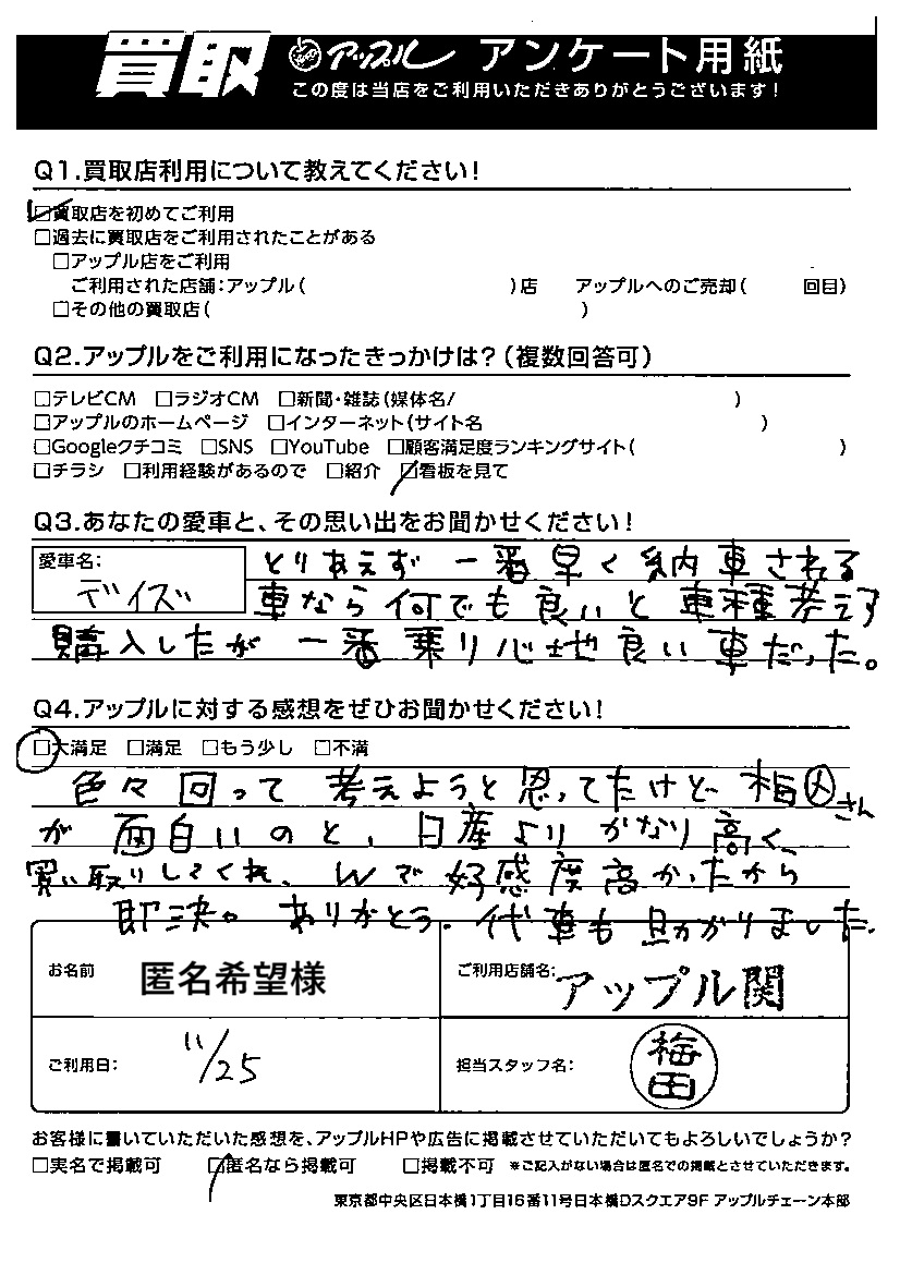 色々回って考えようと思ってたけど梅田さんが面白いのと、日産よりかなり高く買い取りしてくれ、Wで好感度高かったから即決。ありがとう。代車も助かりました。