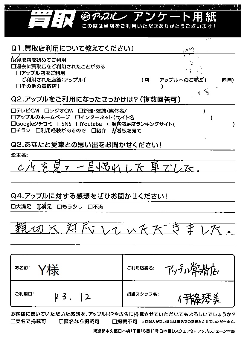 お車のご相談・ 査定だけでもOK! カンタン 入力 30秒 アップルがブランド買取始めました! お電話でも受付中! 受付時間10:00 ~ 19:00 0569-35-6600 お車のご相談・ 査定だけでもOK! カンタン 入力 30秒 アップルがブランド買取始めました! お電話でも受付中! 受付時間10:00 ~ 19:00 0569-35-6600 アップルがブランド買取始めました! お電話でも受付中! 受付時間10:00 ~ 19:00 0569-35-6600 店舗情報 在庫車 スタッフ紹介 ブログ お客様の声 キャンペーン お得 無料査定 click お客様の声 ご記入日: 2021/12/01 Y様 Q あなたと愛車との思い出をお聞かせください!CMを見て一目惚れした車でした。Q アップルに対する感想をぜひお聞かせください!感想:満足親切に対応していただきました。 前へ 次へ お客様の声一覧を見る