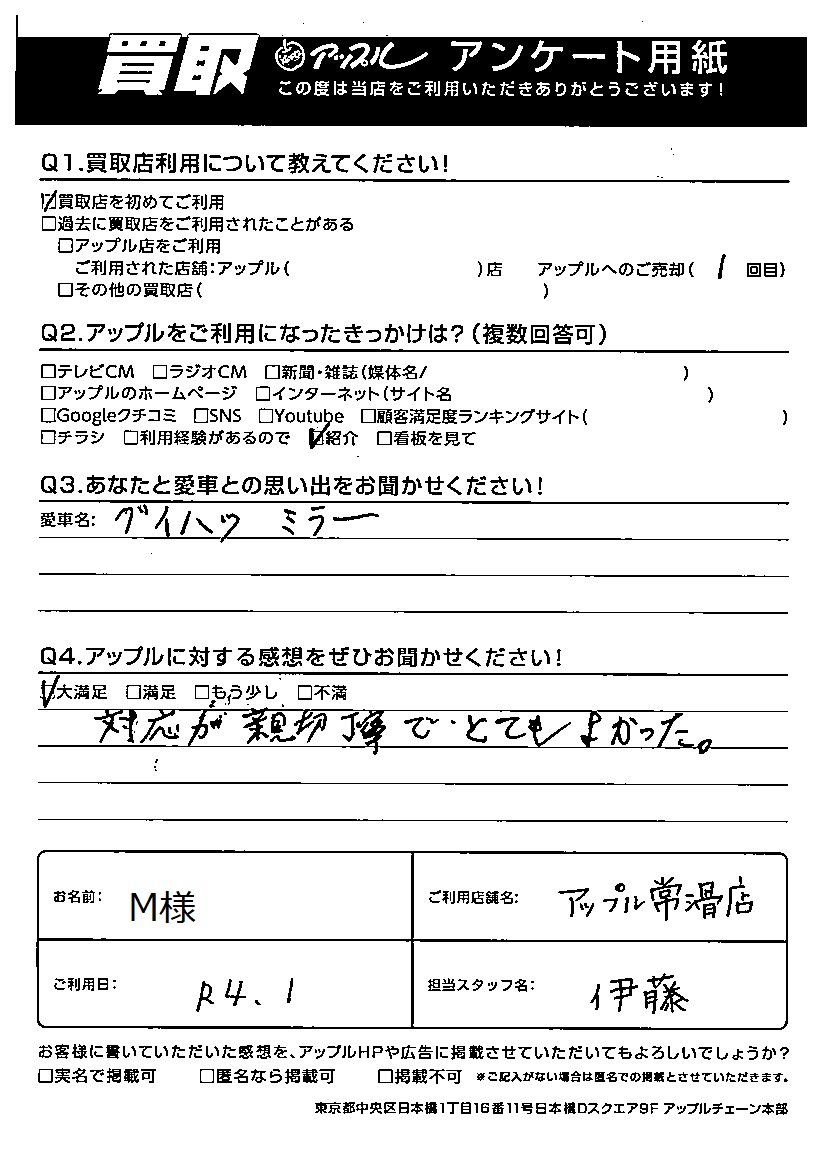お車のご相談・ 査定だけでもOK! カンタン 入力 30秒 アップルがブランド買取始めました! お電話でも受付中! 受付時間10:00 ~ 19:00 0569-35-6600 お車のご相談・ 査定だけでもOK! カンタン 入力 30秒 アップルがブランド買取始めました! お電話でも受付中! 受付時間10:00 ~ 19:00 0569-35-6600 アップルがブランド買取始めました! お電話でも受付中! 受付時間10:00 ~ 19:00 0569-35-6600 店舗情報 在庫車 スタッフ紹介 ブログ お客様の声 キャンペーン お得 無料査定 click お客様の声 ご記入日: 2022/01/31 M様 車名:ダイハツ ミラ Q アップルに対する感想をぜひお聞かせください!感想:大満足対応が親切丁寧でとてもよかった。 前へ 次へ お客様の声一覧を見る