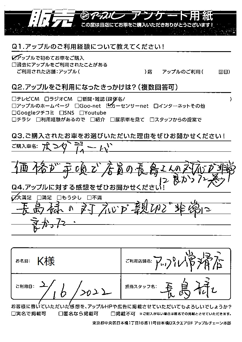長島様の対応が親切で非常に良かった。