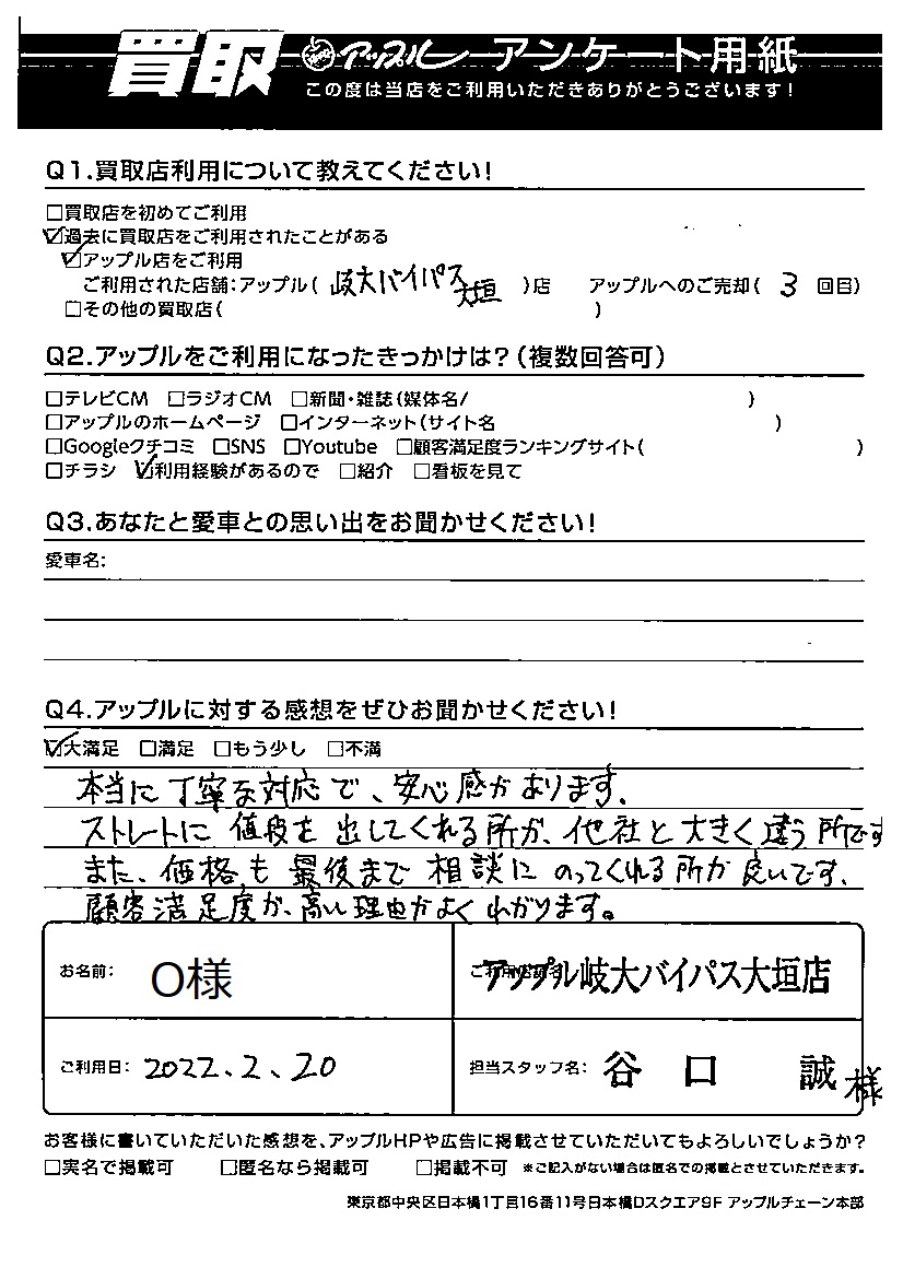 お車のご相談・ 査定だけでもOK! カンタン 入力 30秒 アップルがブランド買取始めました! お電話でも受付中! 受付時間10:00 ~ 19:00 (18:00閉店の場合も有り) 0584-83-8400 お車のご相談・ 査定だけでもOK! カンタン 入力 30秒 アップルがブランド買取始めました! お電話でも受付中! 受付時間10:00 ~ 19:00 (18:00閉店の場合も有り) 0584-83-8400 アップルがブランド買取始めました! お電話でも受付中! 受付時間10:00 ~ 19:00 (18:00閉店の場合も有り) 0584-83-8400 店舗情報 在庫車 スタッフ紹介 ブログ お客様の声 キャンペーン お得 無料査定 click お客様の声 ご記入日: 2022/02/20 O様 Q アップルに対する感想をお聞かせください!感想:大満足本当に丁寧な対応で安心感があります。ストレートに値段を出してくれる所が、他社と大きく違う所です。また、価格も最後まで相談にのってくれる所が良いです。顧客満足度が高い理由がよくわかります。 前へ 次へ お客様の声一覧を見る