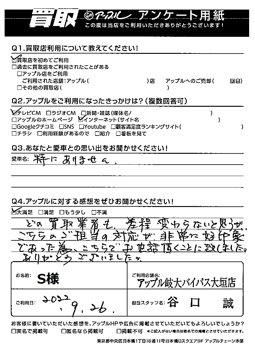 お車のご相談・ 査定だけでもOK! カンタン 入力 30秒 アップルがブランド買取始めました! お電話でも受付中! 受付時間10:00 ~ 19:00 (18:00閉店の場合も有り) 0584-83-8400 お車のご相談・ 査定だけでもOK! カンタン 入力 30秒 アップルがブランド買取始めました! お電話でも受付中! 受付時間10:00 ~ 19:00 (18:00閉店の場合も有り) 0584-83-8400 アップルがブランド買取始めました! お電話でも受付中! 受付時間10:00 ~ 19:00 (18:00閉店の場合も有り) 0584-83-8400 店舗情報 在庫車 スタッフ紹介 ブログ お客様の声 キャンペーン お得 無料査定 click お客様の声 ご記入日: 2022/09/26 S様 Q:アップルに対する感想をぜひお聞かせください!大満足どの買取業者も差程変わらないと思うが、こちらのご担当の対応が非常に好印象であった為、こちらでお世話頂くことに致しました。ありがとうございました。 前へ 次へ お客様の声一覧を見る