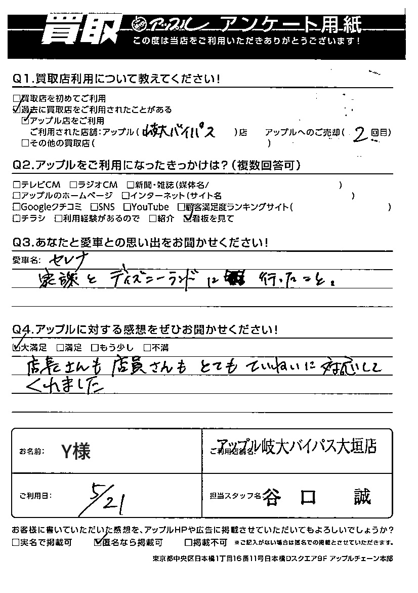 ご利用日:5/21 Y 様