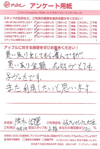 買い取りをしてもらったんですが、買い取り金額、応対がとてもよかったです。