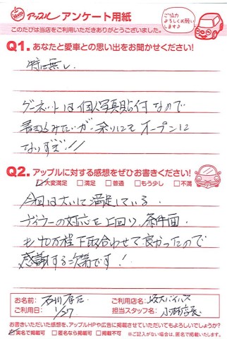これからも今回同様、お値打ちでしかも程度もよい中古車の販売を心がけ、日々努力して参りますので、石川様のお住まいの地域が私どもの大垣市とやや離れてはおりますが、もしまたご縁がございますれば是非お立ち寄りください。