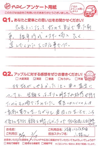 車の査定についても、金額をはっきりと明示され、好感が持てたからその場で決めました。