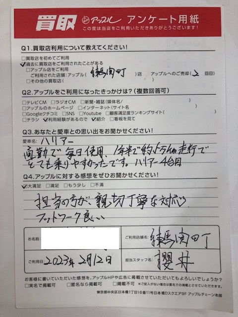 お車のご相談・ 査定だけでもOK! カンタン 入力 30秒 アップルがブランド買取始めました! お電話でも受付中! 受付時間10:00 ~ 19:00 03-5903-8567 お車のご相談・ 査定だけでもOK! カンタン 入力 30秒 アップルがブランド買取始めました! お電話でも受付中! 受付時間10:00 ~ 19:00 03-5903-8567 アップルがブランド買取始めました! お電話でも受付中! 受付時間10:00 ~ 19:00 03-5903-8567 店舗情報 在庫車 スタッフ紹介 ブログ お客様の声 キャンペーン お得 無料査定 click お客様の声 ご記入日: 2023/02/12 東京都練馬区 H・T様 車名:トヨタ ハリアー (H25年12月~のハイブリッド含む) お車:ハリアー Q.愛車との思い出は? 通勤で毎日使用。1年半で約5万km走行でとても乗りやすかったです。ハリアー4台目。Q.アップルの感想は? A.大満足:担当の方が、親切丁寧な対応フットワーク良い 前へ 次へ お客様の声一覧を見る