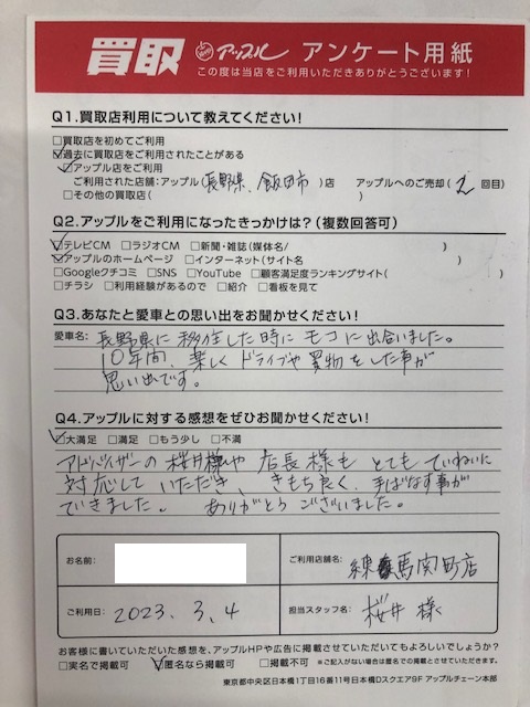 お車:モコ Q.愛車との思い出は? 長野県に移住した時にモコに出合いました。10年間、楽しくドライブや買い物をした事が思い出です。Q.アップルの感想は? A.大満足:アドバイザーの桜井様や店長様もとてもていねいに対応していただき、きもち良く、手ばなす事ができました。ありがとうございました。
