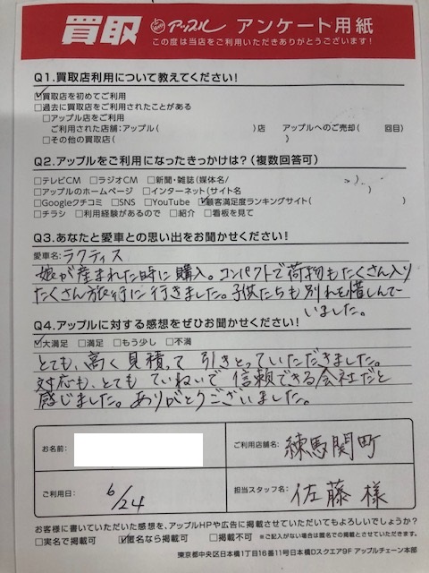 お車:ラクティスQ.愛車との思い出は?娘が産まれたとき時に購入。コンパクトで荷物もたくさん入りたくさん旅行に行きました。子供たちも別れを惜しんでいました。Q.アップルの感想は? A.大満足:とても高く見積って引きとっていただきました。対応も、とてもていねいで信頼できる会社だと感じました。ありがとうございました。