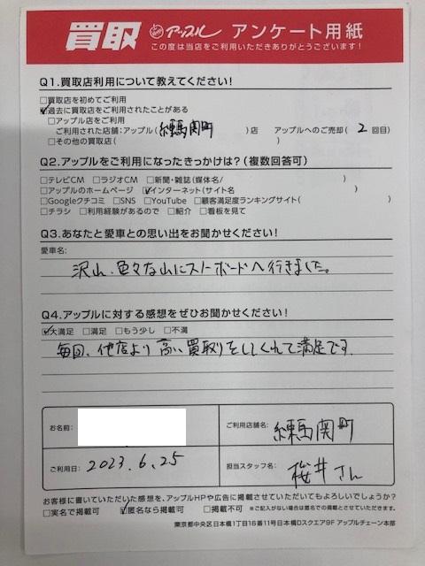 お車のご相談・ 査定だけでもOK! カンタン 入力 30秒 アップルがブランド買取始めました! お電話でも受付中! 受付時間10:00 ~ 19:00 03-5903-8567 お車のご相談・ 査定だけでもOK! カンタン 入力 30秒 アップルがブランド買取始めました! お電話でも受付中! 受付時間10:00 ~ 19:00 03-5903-8567 アップルがブランド買取始めました! お電話でも受付中! 受付時間10:00 ~ 19:00 03-5903-8567 店舗情報 在庫車 スタッフ紹介 ブログ お客様の声 キャンペーン お得 無料査定 click お客様の声 ご記入日: 2023/06/25 東京都西東京市 S・S様 車名:スバル フォレスター お車:フォレスターQ.愛車との思い出は?沢山、色々な山にスノーボードへ行きました。Q.アップルの感想は? A.大満足:毎回、他社より高い買取りをしてくれて満足です。 前へ 次へ お客様の声一覧を見る
