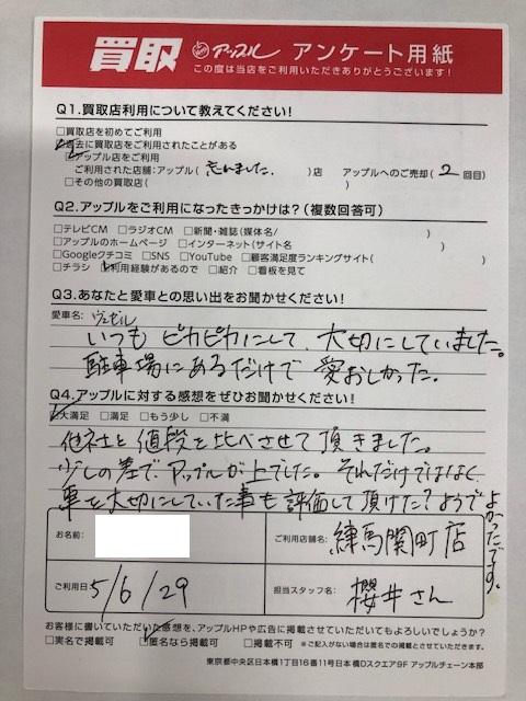 お車:ヴェゼルHVQ.愛車との思い出は?いつもピカピカにして、大切にしていました。駐車場にあるだけで愛おしかった。Q.アップルの感想は? A.大満足:他社と値段を比べさせて頂きました。少しの差で、アップルが上でした。それだけではなく、車を大切にしていた事も評価して頂けた?ようでよかったです。