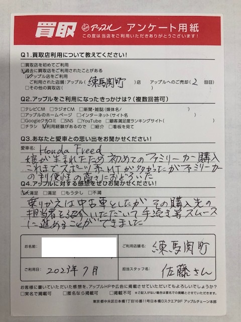 お車:フリードHVQ.愛車との思い出は?娘が生まれたため初めてのファミリーカー購入これまでのスポーツ系MTが多かったがファミリーカーの利便性の高さにおどろいた。Q.アップルの感想は? A.大満足:乗りかえは中古車としたが、その購入先の担当者を紹介いただいて手続き等スムースに進めることができました。