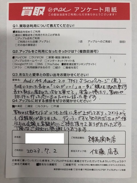お車:Audi A4 Avant 2.0 TFSI Sラインパッケージ(黒)Q.愛車との思い出は?当時小さかった長女の「これがいい!」の一声で購入を決めた車です。長女と新たに産まれた次女を乗せて、実家に帰ったり、買物や旅行に行った思い出のたくさん詰った車です。Q.アップルの感想は? A.大満足:買取の比較サイトでいつも上位に名が上がっており、コメントからも信頼感がありました。ディーラーですと50万円だったのが倍以上の金額を客観的にご提示頂けてありがたかったです。丁寧なご対応に感謝しております。
