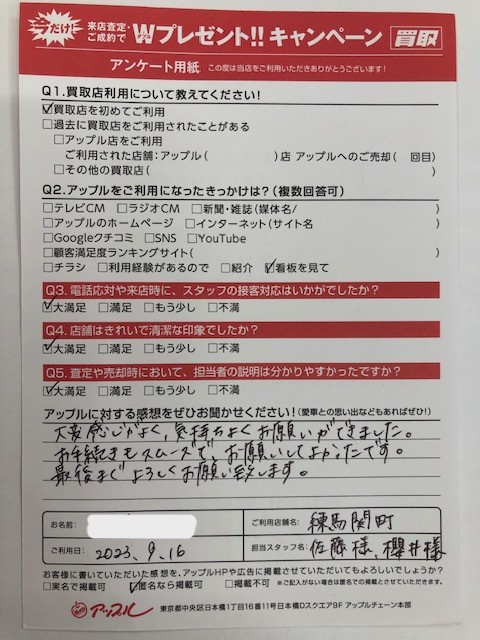 お車のご相談・ 査定だけでもOK! カンタン 入力 30秒 アップルがブランド買取始めました! お電話でも受付中! 受付時間10:00 ~ 19:00 03-5903-8567 お車のご相談・ 査定だけでもOK! カンタン 入力 30秒 アップルがブランド買取始めました! お電話でも受付中! 受付時間10:00 ~ 19:00 03-5903-8567 アップルがブランド買取始めました! お電話でも受付中! 受付時間10:00 ~ 19:00 03-5903-8567 店舗情報 在庫車 スタッフ紹介 ブログ お客様の声 キャンペーン お得 無料査定 click お客様の声 ご記入日: 2023/09/16 東京都杉並区 S・S様 車名:ホンダ N-BOXスラッシュ お車:N-BOXスラッシュQ.アップルに対する感想は? A.大変感じがよく、気持ちよくお願いができました。お手続きもスムーズでお願いしてよかったです。最後までよろしくお願い致します。 前へ 次へ お客様の声一覧を見る