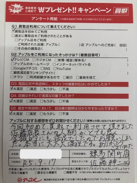 お車のご相談・ 査定だけでもOK! カンタン 入力 30秒 アップルがブランド買取始めました! お電話でも受付中! 受付時間10:00 ~ 19:00 03-5903-8567 お車のご相談・ 査定だけでもOK! カンタン 入力 30秒 アップルがブランド買取始めました! お電話でも受付中! 受付時間10:00 ~ 19:00 03-5903-8567 アップルがブランド買取始めました! お電話でも受付中! 受付時間10:00 ~ 19:00 03-5903-8567 店舗情報 在庫車 スタッフ紹介 ブログ お客様の声 キャンペーン お得 無料査定 click お客様の声 ご記入日: 2023/09/17 東京都練馬区 F・K様 車名:BMW 1シリーズ お車:BMW118DQ.アップルに対する感想は? A.今回初めて買取で利用させて頂きました。佐藤店長さんの人柄がとても良く、金額的にも満足でしたのでお願いしました。本当に大大大満足です。ありがとうございました。 前へ 次へ お客様の声一覧を見る