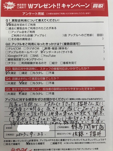 お車のご相談・ 査定だけでもOK! カンタン 入力 30秒 アップルがブランド買取始めました! お電話でも受付中! 受付時間10:00 ~ 19:00 03-5903-8567 お車のご相談・ 査定だけでもOK! カンタン 入力 30秒 アップルがブランド買取始めました! お電話でも受付中! 受付時間10:00 ~ 19:00 03-5903-8567 アップルがブランド買取始めました! お電話でも受付中! 受付時間10:00 ~ 19:00 03-5903-8567 店舗情報 在庫車 スタッフ紹介 ブログ お客様の声 キャンペーン お得 無料査定 click お客様の声 ご記入日: 2023/09/23 東京都練馬区 K・Y様 車名:スズキ ワゴンR お車:ワゴンRQ.アップルに対する感想は? A.店長の佐藤さん、対応して下さった櫻井さん共に笑顔で明るく気さくな感じでよかったです。買い取りの説明も他社の車との比較を開示して見せて下さったので安心して売却できました。帰りも送って下さり心から感謝しています。 前へ 次へ お客様の声一覧を見る