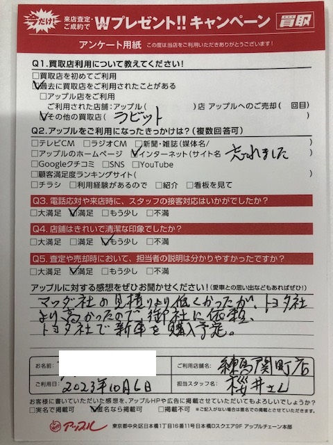 お車のご相談・ 査定だけでもOK! カンタン 入力 30秒 アップルがブランド買取始めました! お電話でも受付中! 受付時間10:00 ~ 19:00 03-5903-8567 お車のご相談・ 査定だけでもOK! カンタン 入力 30秒 アップルがブランド買取始めました! お電話でも受付中! 受付時間10:00 ~ 19:00 03-5903-8567 アップルがブランド買取始めました! お電話でも受付中! 受付時間10:00 ~ 19:00 03-5903-8567 店舗情報 在庫車 スタッフ紹介 ブログ お客様の声 キャンペーン お得 無料査定 click お客様の声 ご記入日: 2023/10/06 東京都練馬区 H・Y様 車名:マツダ CX-5 お車:CX-5Q.アップルに対する感想は? A.満足:マツダ社の見積りより低かったが、トヨタ社より高かったので御社に依頼、トヨタ社で新車を購入予定。 前へ 次へ お客様の声一覧を見る