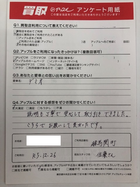 お車のご相談・ 査定だけでもOK! カンタン 入力 30秒 アップルがブランド買取始めました! お電話でも受付中! 受付時間10:00 ~ 19:00 03-5903-8567 お車のご相談・ 査定だけでもOK! カンタン 入力 30秒 アップルがブランド買取始めました! お電話でも受付中! 受付時間10:00 ~ 19:00 03-5903-8567 アップルがブランド買取始めました! お電話でも受付中! 受付時間10:00 ~ 19:00 03-5903-8567 店舗情報 在庫車 スタッフ紹介 ブログ お客様の声 キャンペーン お得 無料査定 click お客様の声 ご記入日: 2023/12/26 東京都練馬区 K・T様 車名:マツダ デミオ お車:デミオ Q.愛車との思い出は?Q.アップルの感想は? A.大満足:説明も丁寧で安心して取り引きできました。こちらでお願いして良かったです。 前へ 次へ お客様の声一覧を見る