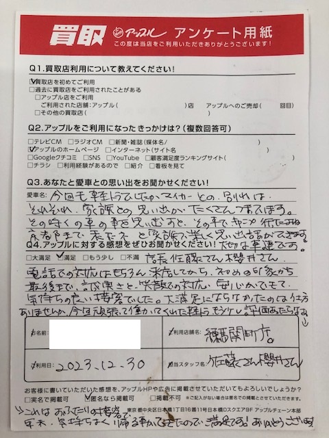 お車:キャリィトラック Q.愛車との思い出は?今回も軽トラでしたかマイカーとの別れは、それぞれ家族との思い出がたくさんつまっています。その時くの車の事を思い出すとその車でキャンプ行ったよね京都まで来たねと家族で楽しく思い出話ができます。大切な車達です。Q.アップルの感想は? A.満足:店長佐藤さん櫻井さん電話での対応はもちろん来店してから初めの印象から最後まで誠実さと笑顔での対応、安心がもて気持ちの良い接客でした。大満足にならなかったのは仕方ありませんが、今回頑張って働いてくれた軽トラもう少し評価あったらなぁ。これはおふたりの接客で年末気持ちよく帰る事ができたので満足です!ありがとうございます。