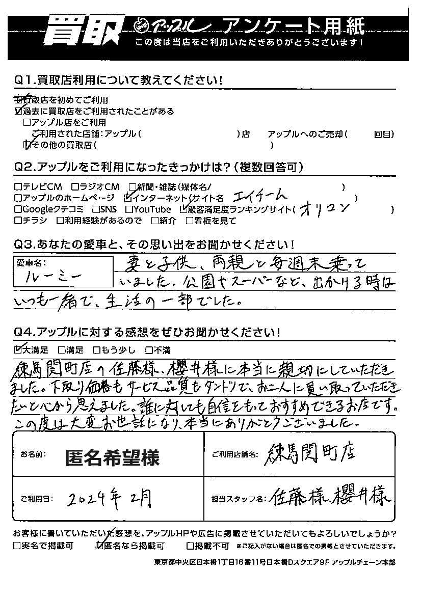 練馬関町店の佐藤様、櫻井様に本当に親切にしていただきました。