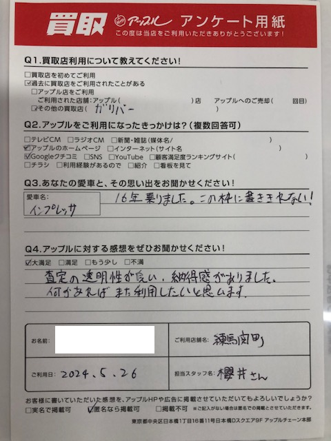 お車のご相談・ 査定だけでもOK! カンタン 入力 30秒 アップルがブランド買取始めました! お電話でも受付中! 受付時間10:00 ~ 19:00 03-5903-8567 お車のご相談・ 査定だけでもOK! カンタン 入力 30秒 アップルがブランド買取始めました! お電話でも受付中! 受付時間10:00 ~ 19:00 03-5903-8567 アップルがブランド買取始めました! お電話でも受付中! 受付時間10:00 ~ 19:00 03-5903-8567 店舗情報 在庫車 スタッフ紹介 ブログ お客様の声 キャンペーン お得 無料査定 click お客様の声 ご記入日: 2024/05/26 練馬区 N・Y様 車名:スバル インプレッサハッチバック お車:インプレッサS-GT Q.愛車との思い出は?16年乗りました。この枠に書ききれない! Q.アップルの感想は?A.大満足:査定の透明性が良い。納得感がありました。何かあればまた利用したいと思います。 前へ 次へ お客様の声一覧を見る