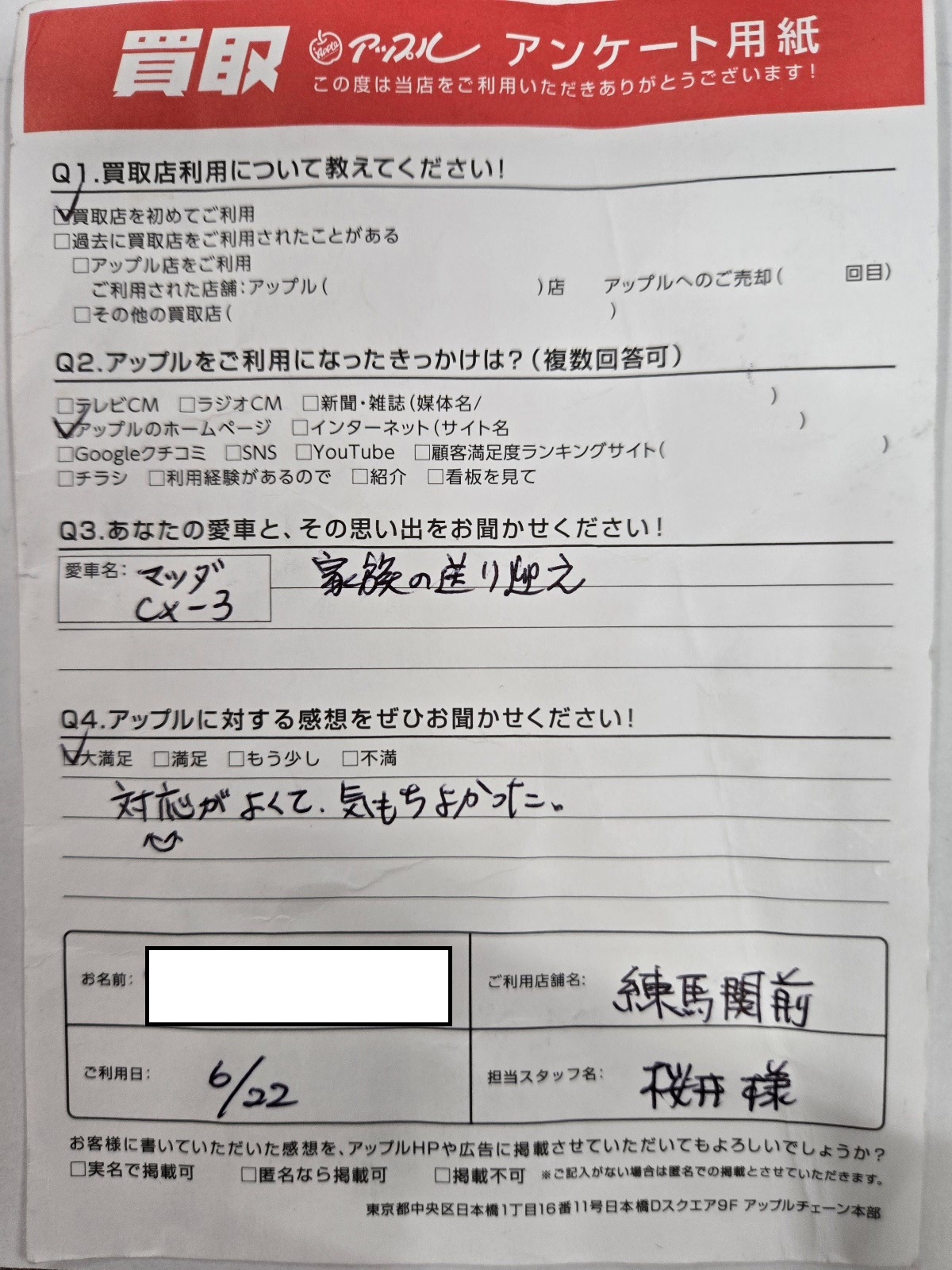 お車のご相談・ 査定だけでもOK! カンタン 入力 30秒 アップルがブランド買取始めました! お電話でも受付中! 受付時間10:00 ~ 19:00 03-5903-8567 お車のご相談・ 査定だけでもOK! カンタン 入力 30秒 アップルがブランド買取始めました! お電話でも受付中! 受付時間10:00 ~ 19:00 03-5903-8567 アップルがブランド買取始めました! お電話でも受付中! 受付時間10:00 ~ 19:00 03-5903-8567 店舗情報 在庫車 スタッフ紹介 ブログ お客様の声 キャンペーン お得 無料査定 click お客様の声 ご記入日: 2024/06/22 西東京市 N・H様 車名:マツダ CX-3 お車:マツダ CX-3 Q.愛車との思い出は?家族の送り迎え Q.アップルの感想は?A.大満足:対応がよくて気持ちよかった。 前へ 次へ お客様の声一覧を見る