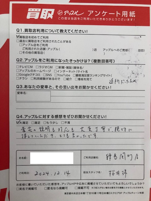 お車のご相談・ 査定だけでもOK! カンタン 入力 30秒 アップルがブランド買取始めました! お電話でも受付中! 受付時間10:00 ~ 19:00 03-5903-8567 お車のご相談・ 査定だけでもOK! カンタン 入力 30秒 アップルがブランド買取始めました! お電話でも受付中! 受付時間10:00 ~ 19:00 03-5903-8567 アップルがブランド買取始めました! お電話でも受付中! 受付時間10:00 ~ 19:00 03-5903-8567 店舗情報 在庫車 スタッフ紹介 ブログ お客様の声 キャンペーン お得 無料査定 click お客様の声 ご記入日: 2024/12/14 練馬区 O・T様 車名:フォルクスワーゲン ポロ お車:VWポロ Q.アップルの感想は?A.大満足:査定の説明も対応も大変丁寧で、親切に接していただき、とても良かったです。 前へ 次へ お客様の声一覧を見る
