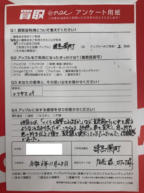 お車のご相談・ 査定だけでもOK! カンタン 入力 30秒 アップルがブランド買取始めました! お電話でも受付中! 受付時間10:00 ~ 19:00 03-5903-8567 お車のご相談・ 査定だけでもOK! カンタン 入力 30秒 アップルがブランド買取始めました! お電話でも受付中! 受付時間10:00 ~ 19:00 03-5903-8567 アップルがブランド買取始めました! お電話でも受付中! 受付時間10:00 ~ 19:00 03-5903-8567 店舗情報 在庫車 スタッフ紹介 ブログ お客様の声 キャンペーン お得 無料査定 click お客様の声 ご記入日: 2024/11/23 西東京市 A・M様 車名:レクサス CT (国内仕様 右H) お車:レクサスCT200h Q.アップルの感想は?A.大満足:他店では「いくらを希望されますか」など査定前から心中を探るようなこともありましたが、こちらは純粋に車を査定し、良い所も悪い所も伝えて頂き、査定額を提示していただいたので、信頼感があった。 前へ 次へ お客様の声一覧を見る