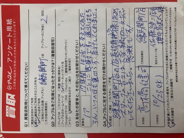 お車のご相談・ 査定だけでもOK! カンタン 入力 30秒 アップルがブランド買取始めました! お電話でも受付中! 受付時間10:00 ~ 19:00 03-5903-8567 お車のご相談・ 査定だけでもOK! カンタン 入力 30秒 アップルがブランド買取始めました! お電話でも受付中! 受付時間10:00 ~ 19:00 03-5903-8567 アップルがブランド買取始めました! お電話でも受付中! 受付時間10:00 ~ 19:00 03-5903-8567 店舗情報 在庫車 スタッフ紹介 ブログ お客様の声 キャンペーン お得 無料査定 click お客様の声 ご記入日: 2024/10/23 練馬区 T・K様 車名:トヨタ ノア お車:ノア Q.愛車との思い出は?17年間生活を支えてくれたことに感謝です。遠出はもちろん、いつの日も裏切らず走行してくれました。 Q.アップルの感想は?A.大満足:練馬関町店の店長佐藤紳二様はじめスタッフの方々は大変親切に対応してくださいました。感激です! 前へ 次へ お客様の声一覧を見る