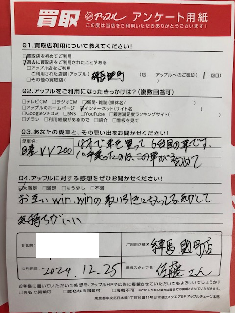 お車のご相談・ 査定だけでもOK! カンタン 入力 30秒 アップルがブランド買取始めました! お電話でも受付中! 受付時間10:00 ~ 19:00 03-5903-8567 お車のご相談・ 査定だけでもOK! カンタン 入力 30秒 アップルがブランド買取始めました! お電話でも受付中! 受付時間10:00 ~ 19:00 03-5903-8567 アップルがブランド買取始めました! お電話でも受付中! 受付時間10:00 ~ 19:00 03-5903-8567 店舗情報 在庫車 スタッフ紹介 ブログ お客様の声 キャンペーン お得 無料査定 click お客様の声 ご記入日: 2024/12/25 練馬区 Y・A様 車名:日産 NV200バネット お車:日産NV200 Q.愛車との思い出は?18才で車を買って6台目の車です。10年乗ったのは、この車が初めて Q.アップルの感想は?A.大満足:お互いwin、winの取り引きになってる気がして気持ちがいい 前へ 次へ お客様の声一覧を見る
