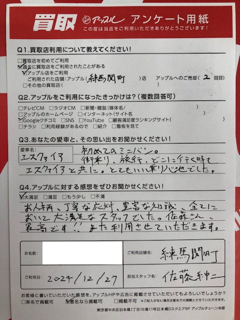 お車:エスクァイア Q.愛車との思い出は?初めてのミニバン。街乗り、旅行、どこに行く時もエスクァイアと共に。とてもいい乗り心地でした。 Q.アップルの感想は?A.大満足:お人柄、丁寧な応対、豊富な知識、全てにおいて大満足なスタッフでした。佐藤さん、最高です!!また利用させていただきます。