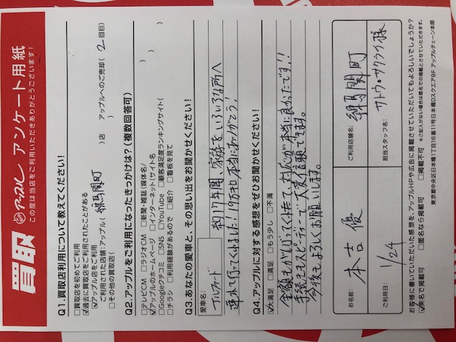 お車:アルファード Q.愛車との思い出は?約17年間、家族をいろいろな所へ連れて行ってくれました!19万キロ本当にありがとう! Q.アップルの感想は?A.大満足:金額もがんばってくれて、対応が本当に良かったです!!手続きもスピーディーで大変信頼できます。今後もよろしくお願いします。