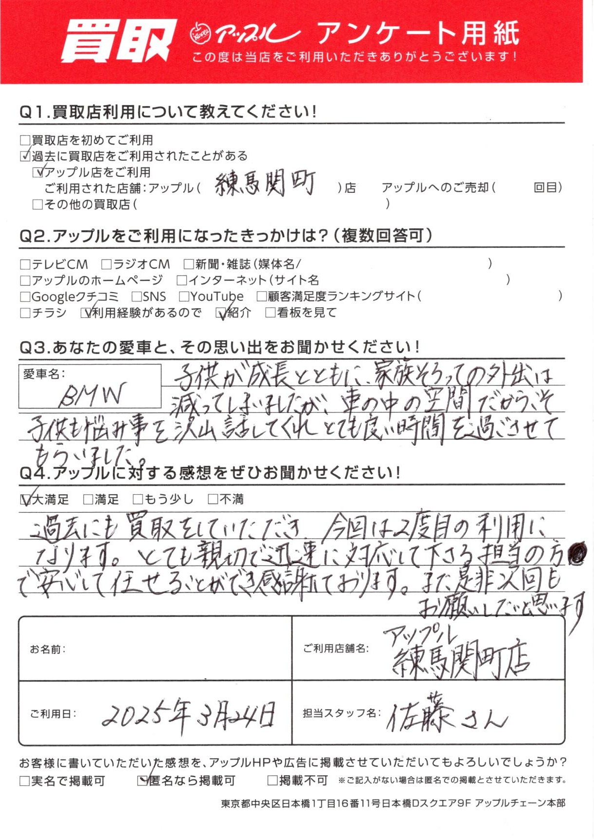 お車:BMW Q.愛車との思い出は?子供が成長とともに、家族そろっての外出は減ってしまいましたが、車の中の空間だからこそ子供も悩み事を沢山話してくれとても良い時間を過ごさせてもらいました。 Q.アップルの感想は?A.大満足:過去にも買取していただき、今回は2度目の利用になります。とても親切で迅速に対応して下さる担当の方で安心して任せることができ感謝しております。また是非次回もお願いしたいと思います。
