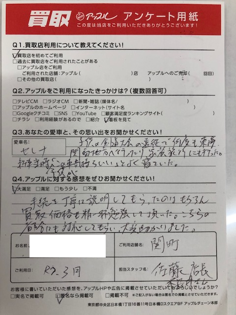 お車:セレナ Q.愛車との思い出は?子供の剣道大会の遠征で何度も東海、関西地方へ行ったり、家族旅行にも行った。新車当時子供が「この車気持ちいい」と良く寝ていた。 Q.アップルの感想は?A.大満足:手続を丁寧に説明してもらったのはもちろん買取価格も精一杯勉強して頂いた。こちらの都合にも対応してもらい、大変助かりました。