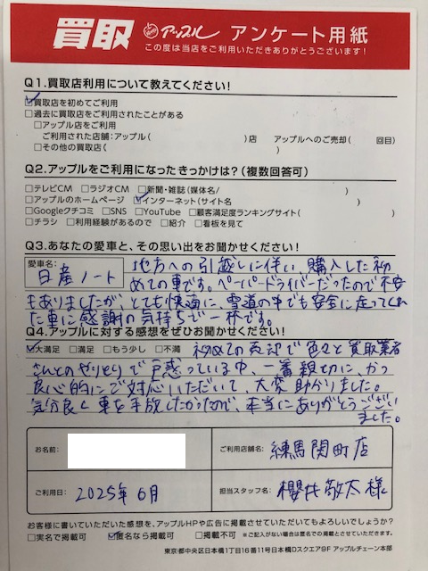 お車:ノート Q.愛車との思い出は?地方への引越しに伴い、購入した初めての車です。ペーパードライバーだったので不安もありましたが、とても快適に、雪道の中でも安全に走ってくれた車に感謝の気持ちで一杯です。 Q.アップルの感想は?A.大満足:初めての売却で色々と買取業者さんとのやりとりで戸惑っている中、一番親切に、かつ良心的にご対応いただいて、大変助かりました。気分良く車を手放したかったので、本当にありがとうございました。