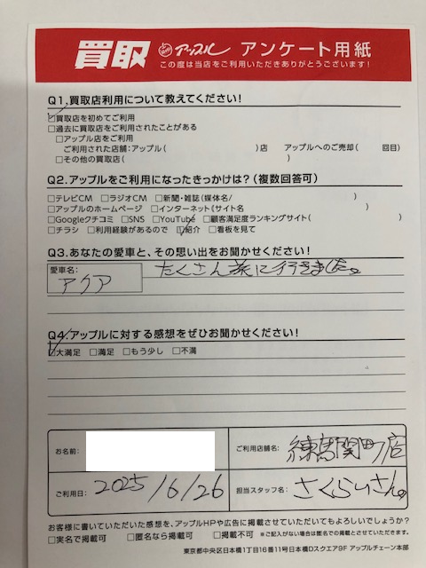 お車のご相談・ 査定だけでもOK! カンタン 入力 30秒 アップルがブランド買取始めました! お電話でも受付中! 受付時間10:00 ~ 19:00 03-5903-8567 お車のご相談・ 査定だけでもOK! カンタン 入力 30秒 アップルがブランド買取始めました! お電話でも受付中! 受付時間10:00 ~ 19:00 03-5903-8567 アップルがブランド買取始めました! お電話でも受付中! 受付時間10:00 ~ 19:00 03-5903-8567 店舗情報 在庫車 スタッフ紹介 ブログ お客様の声 キャンペーン お得 無料査定 click お客様の声 ご記入日: 2025/06/26 足立区 T・S様 車名:トヨタ アクア お車:アクア Q.愛車との思い出は?たくさん旅に行きました。 Q.アップルの感想は?A.大満足: 前へ 次へ お客様の声一覧を見る