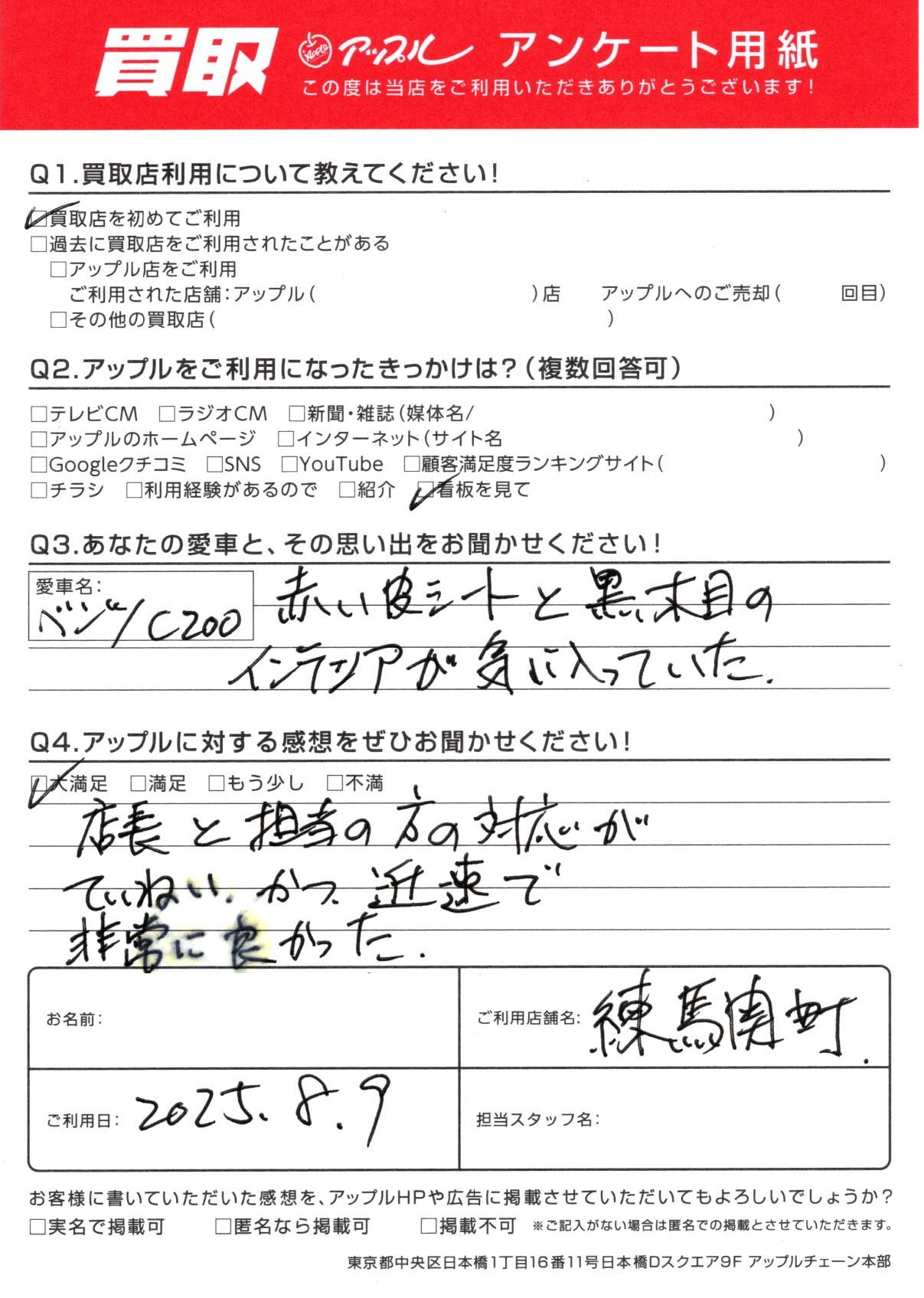 お車のご相談・ 査定だけでもOK! カンタン 入力 30秒 アップルがブランド買取始めました! お電話でも受付中! 受付時間10:00 ~ 19:00 03-5903-8567 お車のご相談・ 査定だけでもOK! カンタン 入力 30秒 アップルがブランド買取始めました! お電話でも受付中! 受付時間10:00 ~ 19:00 03-5903-8567 アップルがブランド買取始めました! お電話でも受付中! 受付時間10:00 ~ 19:00 03-5903-8567 店舗情報 在庫車 スタッフ紹介 ブログ お客様の声 キャンペーン お得 無料査定 click お客様の声 ご記入日: 2025/08/09 練馬区 Y・Y様 車名:メルセデス・ベンツ Cクラスワゴン お車:ベンツC200 Q.愛車との思い出は?赤い皮シートと黒木目のインテリアが気に入っていた。 Q.アップルの感想は?A.大満足:店長と担当の方の対応がていねいかつ、迅速で非常に良かった。 前へ 次へ お客様の声一覧を見る