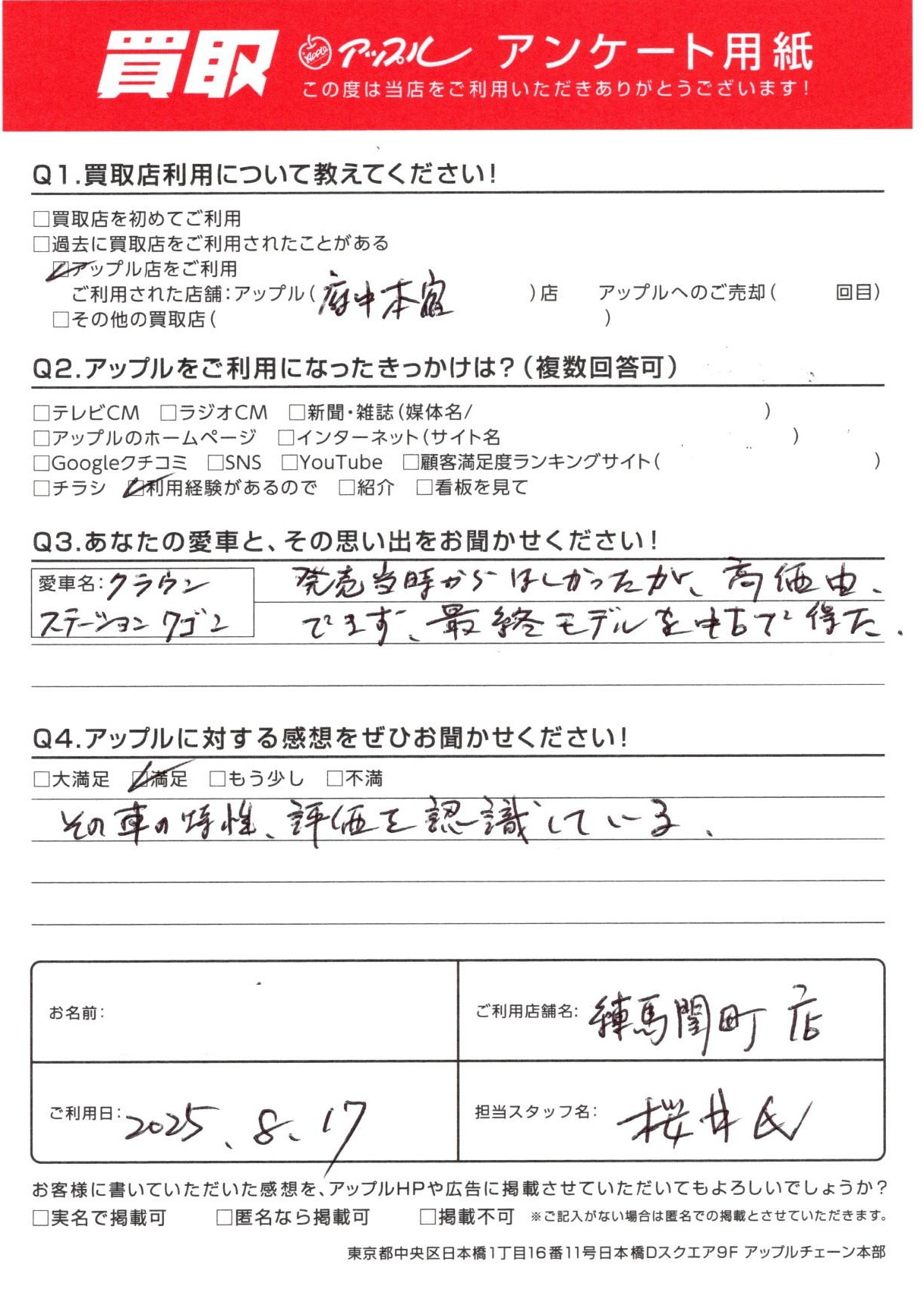 お車のご相談・ 査定だけでもOK! カンタン 入力 30秒 アップルがブランド買取始めました! お電話でも受付中! 受付時間10:00 ~ 19:00 03-5903-8567 お車のご相談・ 査定だけでもOK! カンタン 入力 30秒 アップルがブランド買取始めました! お電話でも受付中! 受付時間10:00 ~ 19:00 03-5903-8567 アップルがブランド買取始めました! お電話でも受付中! 受付時間10:00 ~ 19:00 03-5903-8567 店舗情報 在庫車 スタッフ紹介 ブログ お客様の声 キャンペーン お得 無料査定 click お客様の声 ご記入日: 2025/08/17 U・H様 車名:トヨタ クラウンワゴン(~H11年8月) お車:クラウンステーションワゴン Q.愛車との思い出は?発売当時からほしかったが、高価由できず、最終モデルを中古で得た。Q.アップルの感想は?A.満足:その車の特性、評価を認識している。 前へ 次へ お客様の声一覧を見る